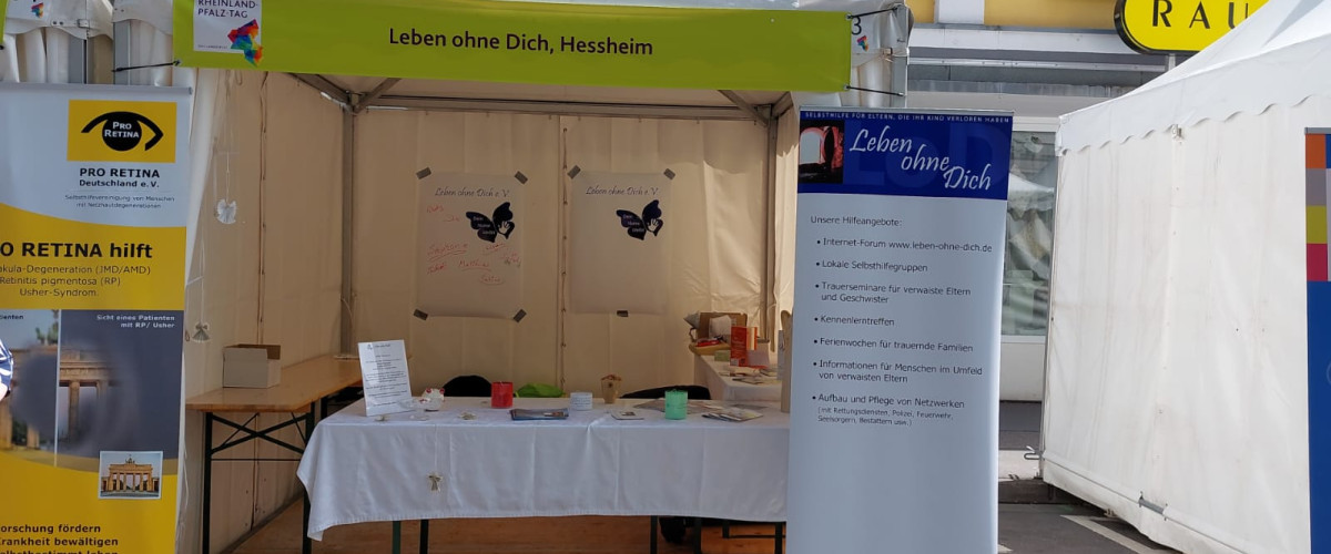 Die Selbsthilfegruppe von Leben ohne Dich in Hessheim war an allen drei Veranstaltungstagen präsent. Einige TeilnehmerInnen unserer Selbsthilfegruppe hatten an einem Kreativabend im Mai kleine Engelchen aus Gesangbuchseiten, Windlichter mit zum Nachdenken anregenden Versen und Origami-Friedenstauben gefertigt. Diese Give-aways zogen die Aufmerksamkeit der Besucher auf sich und boten zudem die Möglichkeit, eines guten Gesprächsanfangs.