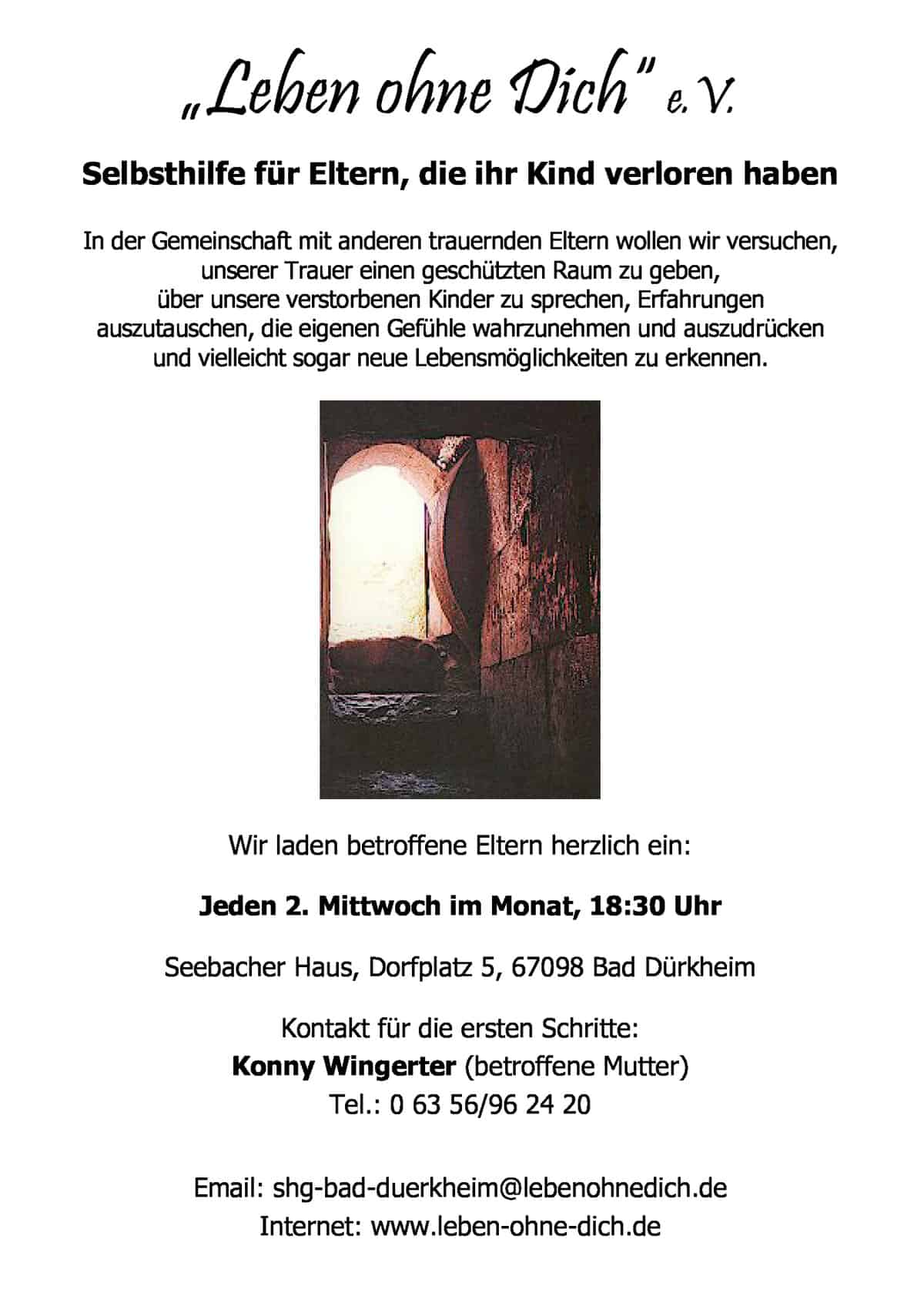 Die Selbsthilfegruppe Bad Dürkheim ist eine Gruppe des Vereins „Leben ohne Dich“® e.V. für Eltern, deren Kind verstorben ist. Wir treffen uns regelmäßig einmal im Monat zu einem persönlichen Austausch unter Betroffenen.